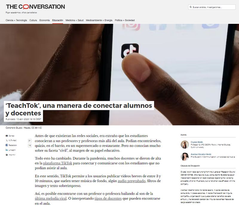 Article in The Conversation (Spain): 'TeachTok', una manera de conectar alumnos y docentes