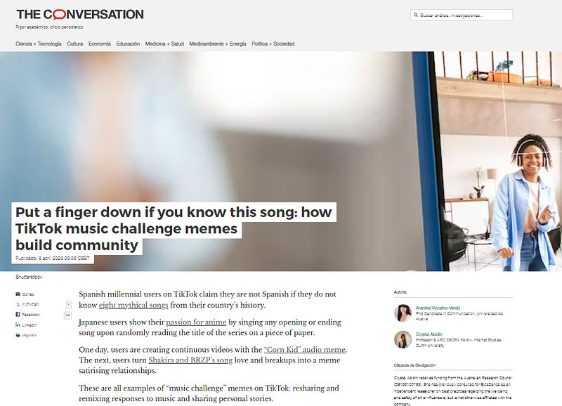 Article in The Conversation (Australia): Put a finger down if you know this song: how TikTok music challenge memes build community