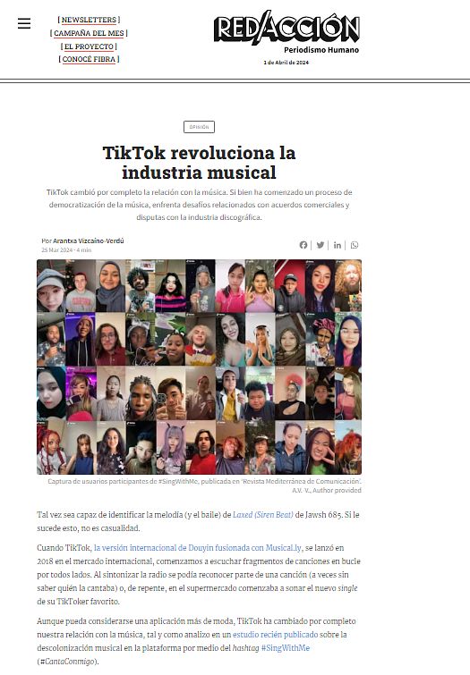 Article in Redacción (Periodismo Humano): TikTok revoluciona la industria musical